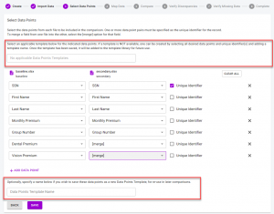 We have added the ability for a user to create and re-use both data point selection as well as export customization templates.  If an applicable template matching the imported data points exists, it can be selected in the dropdown menu and the saved data points and unique identifier will be auto selected for the user.  However, if no applicable template exists, a new template can be created by selecting the desired data points along with the unique identifier(s) and then adding a name and saving.