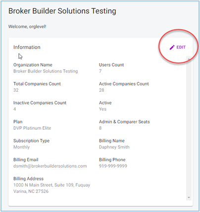 We have added the ability for the user to add and update Billing Contact Information for the Organization. The billing contact name, email address, phone number, and mailing address are now viewable for the user. This information can be added/updated by clicking the EDIT option and then updated/added. All greyed out fields are unavailable for the user to edit.